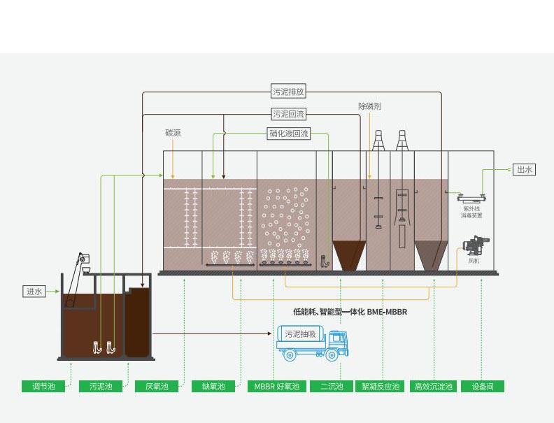 包含厭氧池、缺氧池、MBBR好氧池、二沉池、絮凝反應池、高效沉淀池、設備間及配套輔助等單元。